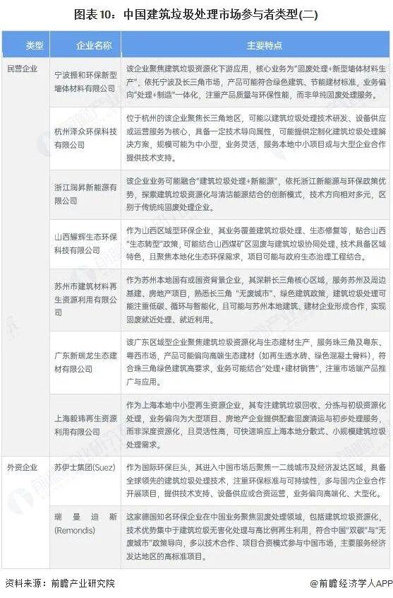 中国建建垃圾处置市场参取者类型次要包罗国有企业、平易近营企业和外资企业。建建垃圾处置财产各类型企业中的代表性企业及其次要特点如下?。